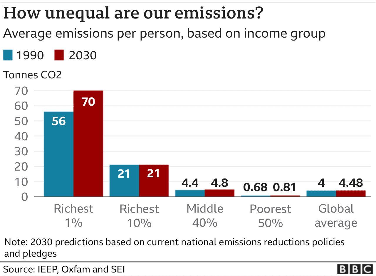 Dar cei 1% din lume nu sunt doar miliardari sau milionari - includ pe oricine care câștigă peste 172.000 de dolari pe an sau 150.000 de euro pe an. Cei mai bogați 10% din lume - adică oricine câștigă peste 55.000 de dolari pe an sau 47.000 de euro pe an - au și ei emisii de CO2 ridicate. Cei mai bogați 10% emit de nouă ori mai mult carbon decât cota lor.
