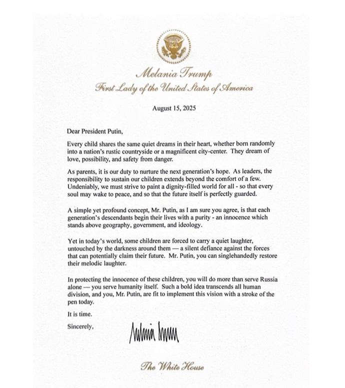 Prima Doamnă Melania Trump i-a trimis o "scrisoare de pace" președintelui rus Vladimir Putin, în care i-a spus că "a venit timpul să protejeze copiii și generațiile viitoare din întreaga lume". Scrisoarea, obținută în exclusivitate de Fox News, a fost înmânată personal de Donald Trump lui Putin, înaintea summitului lor din Alaska. Imediat după ce a primit scrisoarea, Putin a citit-o în fața delegațiilor americane și ruse.