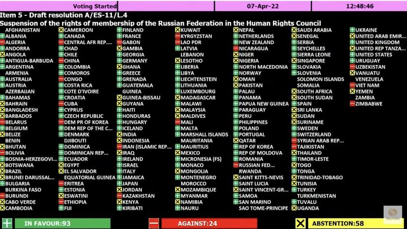 Adunarea Generală a Naţiunilor Unite, formată din 193 de membri, a suspendat joi Rusia din funcţia de membru al Consiliului ONU pentru Drepturile Omului ca răspuns la presupusele abuzuri pe care le comite în Ucraina. Dintre aceștia, 24 au votat impotriva excluderii Rusiei, iar 58 s-au abținut.