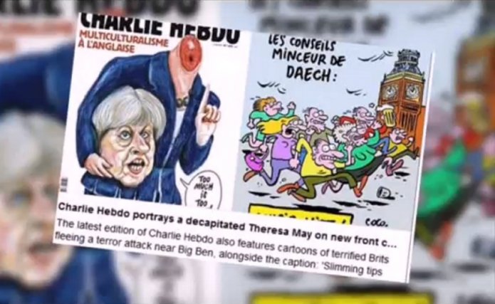 Revista de satiră franceză Charlie Hebdo a publicat pe prima pagină a noului număr o caricatură care o prezintă pe Theresa May decapitată. Revista include şi un desen care ironizează victimele atacului terorist de pe London Bridge, informează The Telegraph.