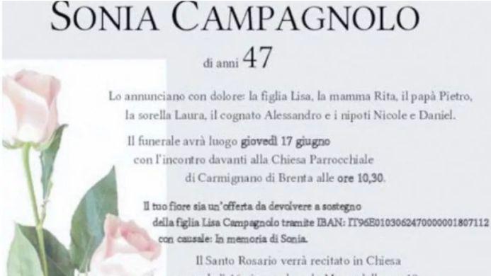 O mamă răpusă de cancer la 47 de ani s-a stins cu gândul la fiica ei, studentă la o facultate din Italia, care a rămas singură pe lume. Înainte de a muri, Sonia Campagnolo a cerut ca pe crucea ei să fie trecut un cont Iban, ca oamenii să-i poate veni în ajutor copilei sale să-și încheie studiile.