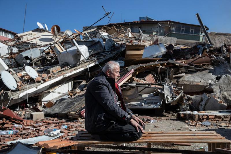Un sinistrat se roagă printre ruine în Hataz, Turcia,