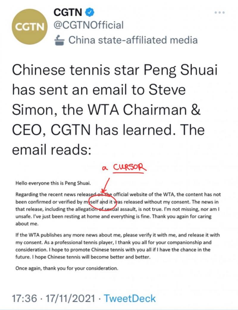 Canalul de stat chinez CGTN a prezentat miercuri seara, pe Twitter, o captură de ecran a unui mail atribuit lui Shuai Peng, pe care jucătoarea chineză l-ar fi trimis conducerii WTA, fără ca autenticitatea mesajului să poată fi confirmată.