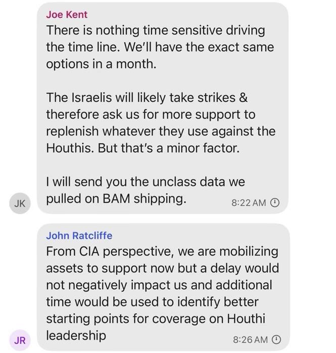 Mesajele noi publicate au fost trimise pe 15 martie. Acestea includ texte de la Pete Hegseth care descriu planuri de atacuri aeriene asupra Yemenului. Waltz răspunde despre rezultatele loviturilor aeriene, iar apoi vicepreședintele JD Vance și directorul CIA John Ratcliffe răspund cu laude și felicitări.