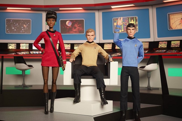 La împlinirea a jumătate de secol de la apariţia celebrului univers SF – Star Trek, producătorul american de jucării Mattel marchează evenimentul prin lansarea unei colecţii de păpuşi Barbie create după personajele celebre din seria originală: căpitanul James T. Kirk, Spock şi Uhura.