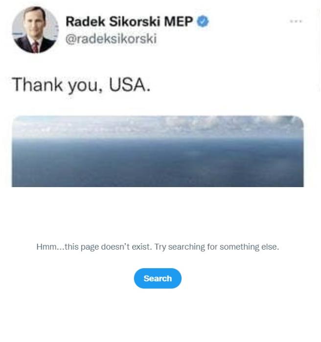 Fostul ministru polonez de externe Radoslaw Sikorski a postat luni pe Twitter o imagine cu scurgerea de gaze din Marea Baltică și mesajul: ''Mulţumim, SUA''. Ulterior, politicianul a șters postarea, fără alte explicații.