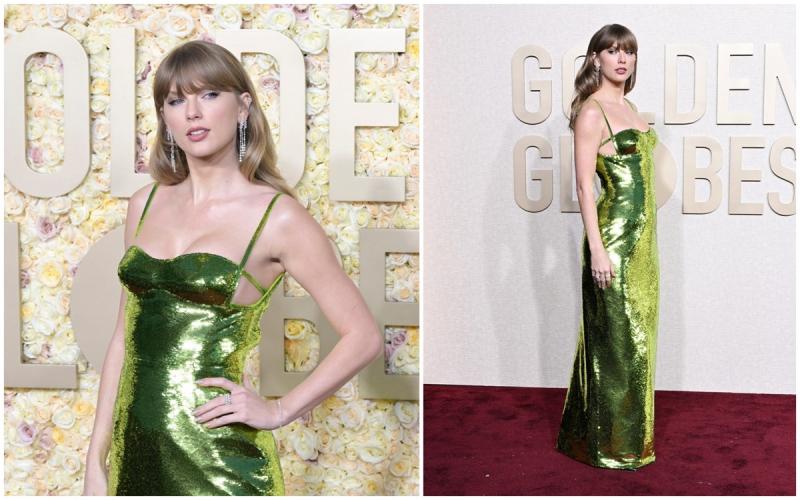 Vedeta "Eras Tour" a evitat covorul roşu pentru a se strecura în linişte la Globurile de Aur, dar alegerea sa vestimentară nu a fost deloc discretă. Nominalizată la categoria "realizări cinematografice şi de box office" pentru "Taylor Swift: The Eras Tour", rochia ei de culoare verde strălucitor, semnată Sabato De Sarno de la Gucci, a fost împodobită peste tot cu paiete, în timp ce bijuteriile sale de la De Beers totalizau peste 33 de carate de diamante albe. Swift a completat look-ul cu pantofii stiletto Kate de Christian Louboutin din piele verde.