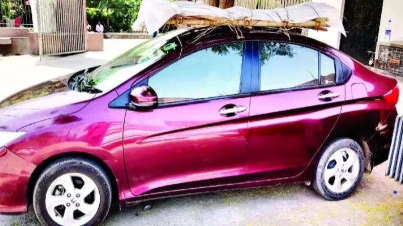 O imagine arăta un corp învelit și legat de acoperișul unei mașini roșii mici.