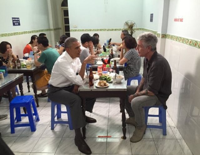 Obama a renunţat la protocol şi a mers în modestul, dar renumitul restaurant "Bun Cha Huong Lien", unde a mâncat supă de porc cu tăiţei alături de Anthony Bourdain, critic gastronomic al CNN, ale cărui emisiuni conțin specialități culinare din jurul lumii.