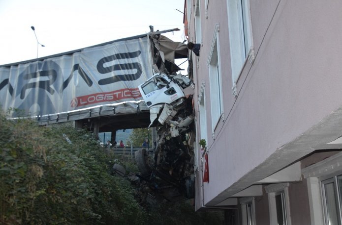 Potrivit presei locale, șoferul unui TIR a pierdut controlul volanului și a intrat cu toată viteza într-un apartament situat la etajul doi al unui bloc din orașul Karamürsel, regiunea Kocaeli.