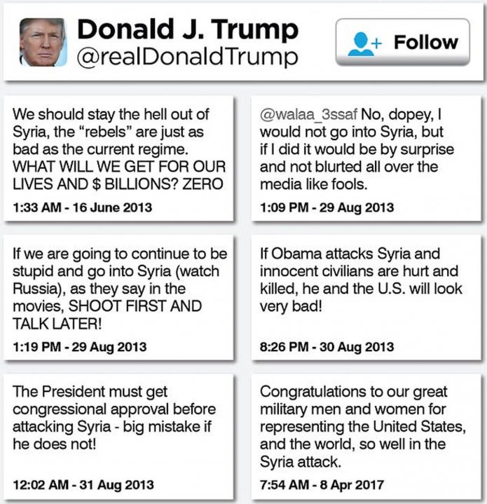 La mai puţin de 24 de ore după acest mesaj, Statele Unite au bombardat cu 59 de rachete Tomahawk o bază aerienă aparţinând forţelor guvernamentale din Siria, deşi în trecut el a susţinut că SUA nu ar trebui să se implice în acest conflict.
