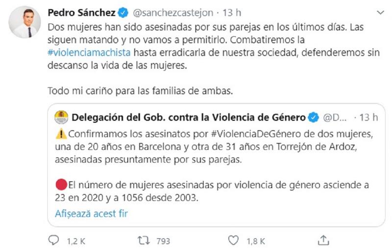Toată compasiunea mea pentru familiile amândurora", a scris premierul Pedro Sanchez, pe Twitter, unde a distribuit o postare a Delegației Guvernului împotriva violenței de gen.