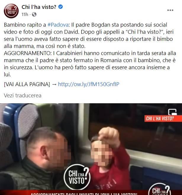 David, băiețelul român răpit, marți dimineață, de pe o stradă din Padova, Italia, în timp ce mergea cu mama lui spre grădiniță, a fost găsit. Anunțul a fost făcut de "Quarto grado", o emisiune a televiziunii italiene Mediaset.