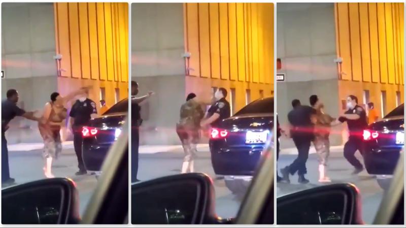 O femeie îi dă două croșee unui polițist, după care e doborâtă cu un pumn de un alt polițist