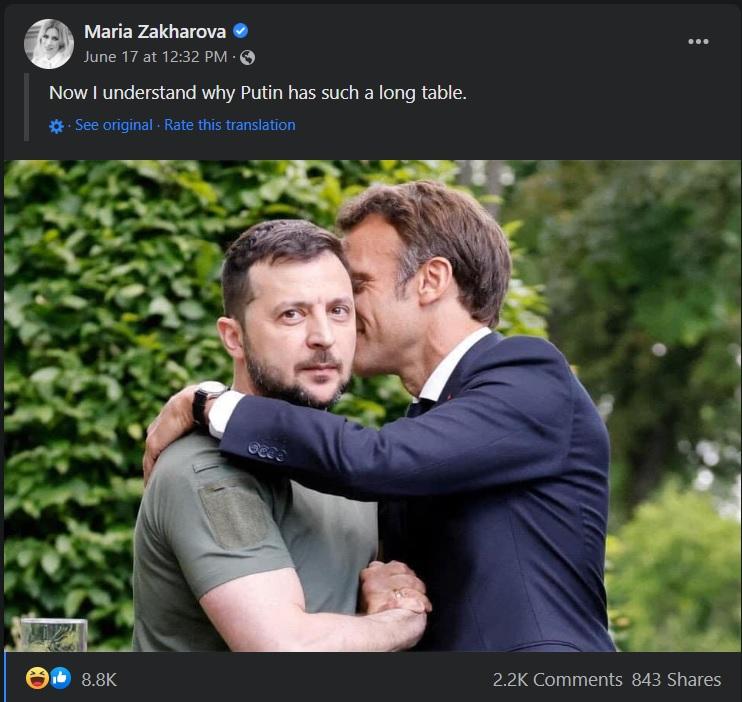 Purtătoarea de cuvânt a MAE rus, ironie despre o poză cu Zelenski și Macron: Acum înțeleg de ce are Putin o masă așa lungă