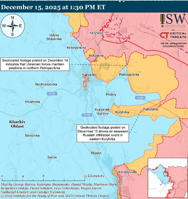 Imagini din satelit publicate pe 14 și 15 decembrie arată că forțele ruse probabil nu mai controlează localitatea Petropavlivka, aflată la est de Kupiansk, în ciuda declarațiilor Moscovei care susțin contrariul. Chiar și unii bloggeri militari ruși recunosc că situația armatei ruse în zonă este gravă. Unul dintre ei susţine că rușii mai controlează doar câteva poziții din nordul și centrul Kupianskului, în timp ce restul orașului este fie disputat, fie se află sub control ucrainean.
