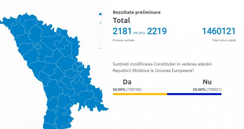UPDATE - După numărarea a 98,33% din procesele verbale, scorul este DA 50,03% (730832) şi NU 49,97% (730088). Diferența a crescut la 744 de voturi, în favoarea taberei pro-UE, care susține aderarea Republicii Moldova la Uniunea Europeană.