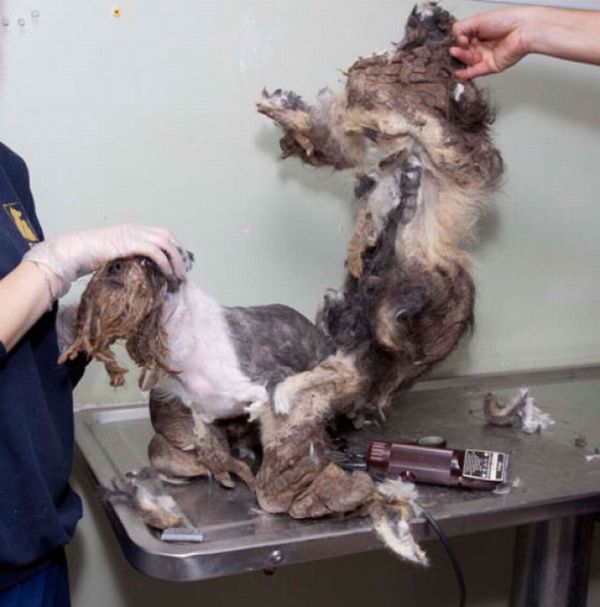 Acest căţel este extrem de greu de recunoscut. De fapt, nici nu arată a câine! Extrem de murdar şi cu blana crescută în exces şi încurcată el nu arată nici măcar a animal, cu atât mai puţin cu un câine!