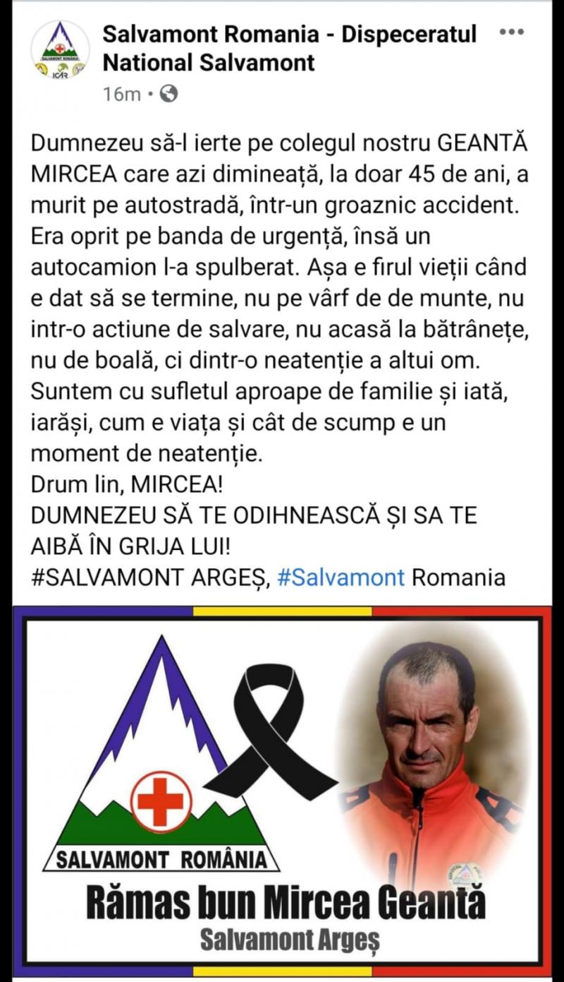Bărbatul care a murit era salvamontist în Argeş. Salvamontiştii din Argeş au postat un mesaj la scurt timp după ce colegul lor a murit.