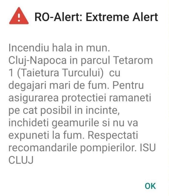 De asemenea, autoritățile au transmis și un mesaj Ro-Alert: "Incendiu Hala mun. Cluj-Napoca cu degajări mari de fum. Pentru asigurarea protecţiei, rămâneţi pe cât posibil în incinte, închideţi geamurile şi nu vă expuneţi la fum. Respectaţi recomandările pompierilor".