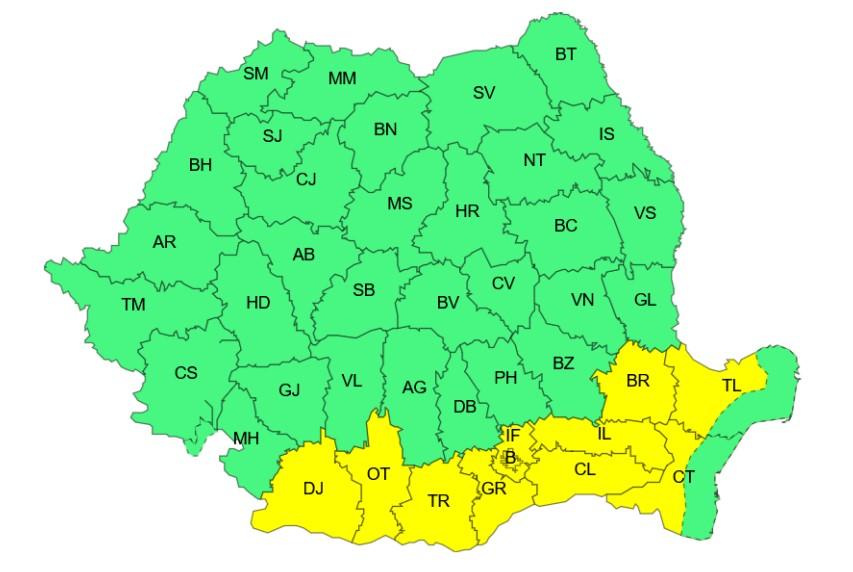 12 judeţe intră de la ora 12.00 sub avertizare cod galben de ploi torenţiale, grindină şi vijelii