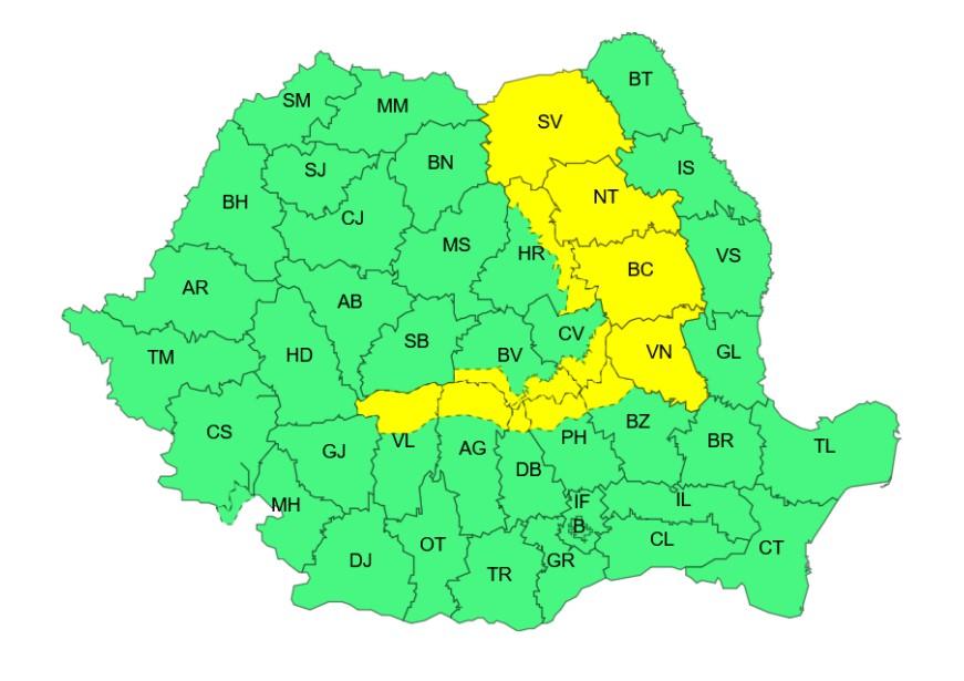 12 judeţe intră de la ora 12.00 sub avertizare cod galben de ploi torenţiale, grindină şi vijelii