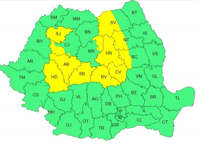 12 județe, sub alertă de vreme severă. Ploi torențiale, grindină și vijelii puternice până la noapte