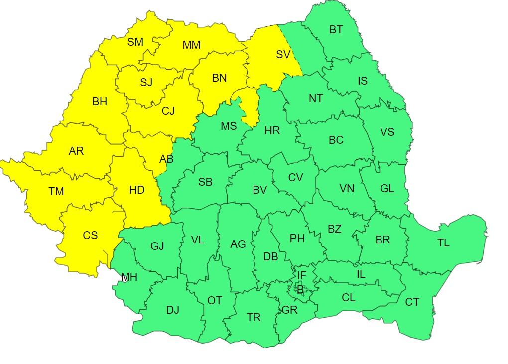 Harta județelor afectate de codul galben de ploi | Sursa foto: meteoromania.ro