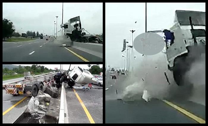Imagini groaznice pe autostradă. Şoferul unui TIR a adormit la volan, fără centură de siguranţă. Maşina s-a izbit de un parapet şi a fost aruncat prin geam (video) | Imaginea 1 din 4 | Galerie Foto