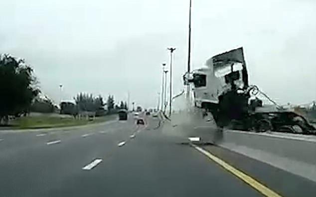 Imagini groaznice pe autostradă. Şoferul unui TIR a adormit la volan, fără centură de siguranţă. Maşina s-a izbit de un parapet şi a fost aruncat prin geam (video)