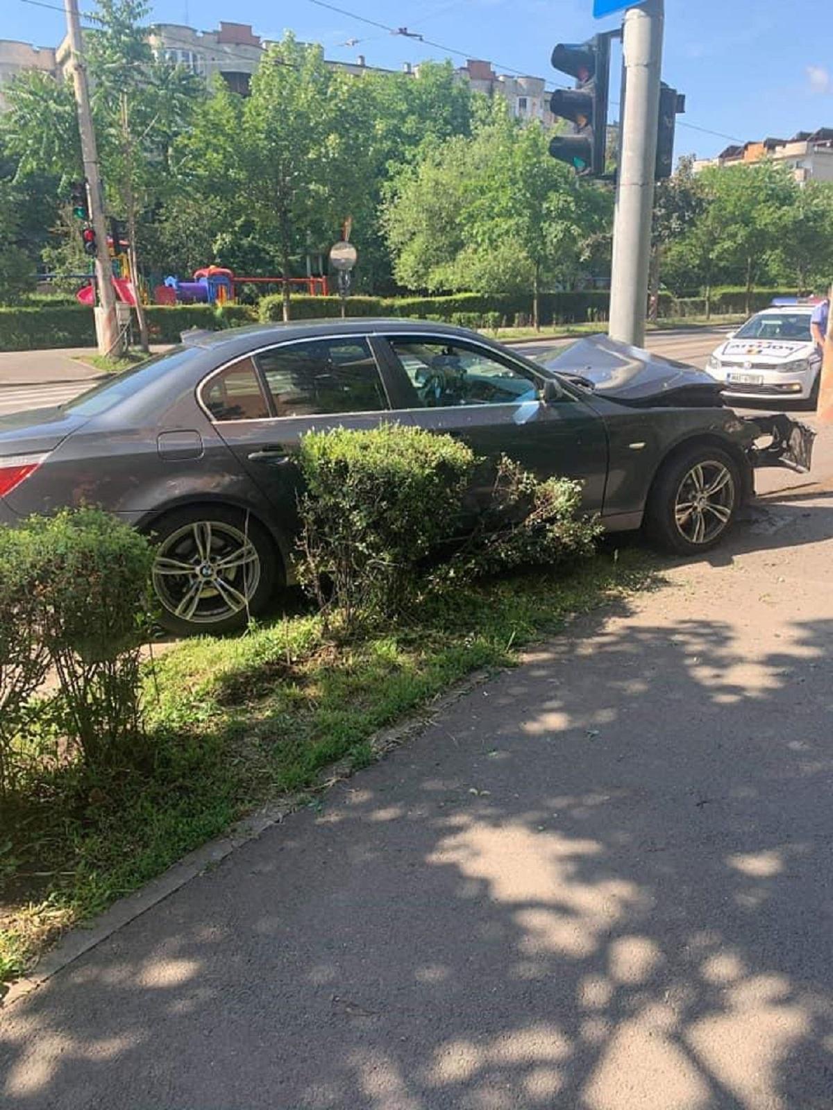 Singur pe șosea, un șofer s-a înfipt cu BMW-ul într-un stâlp, la Cluj-Napoca