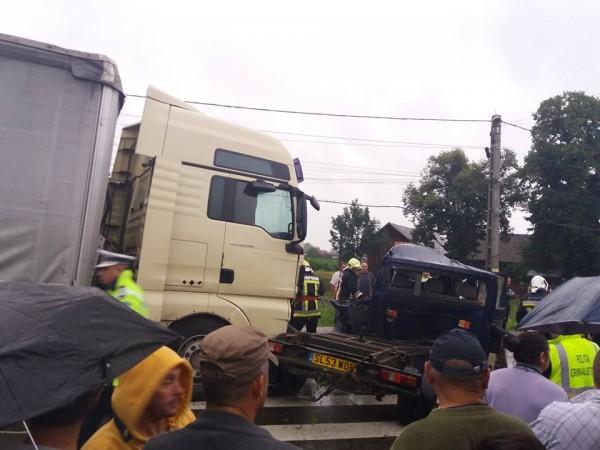 Accident devastator la Milişăuţi, 1 mort şi 3 răniţi în stare critică. Pe o ploaie torenţială, un TIR a spulberat o camionetă