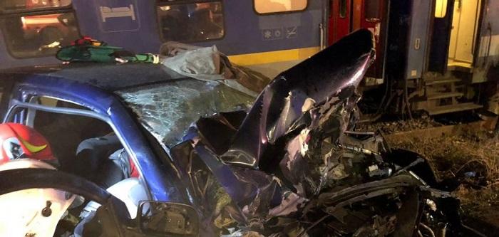 Imagini îngrozitoare! Două maşini s-au izbit în Bistriţa, la Feldru, una dintre ele a fost aruncată în faţa trenului. Trei oameni au rămas încarceraţi (video)