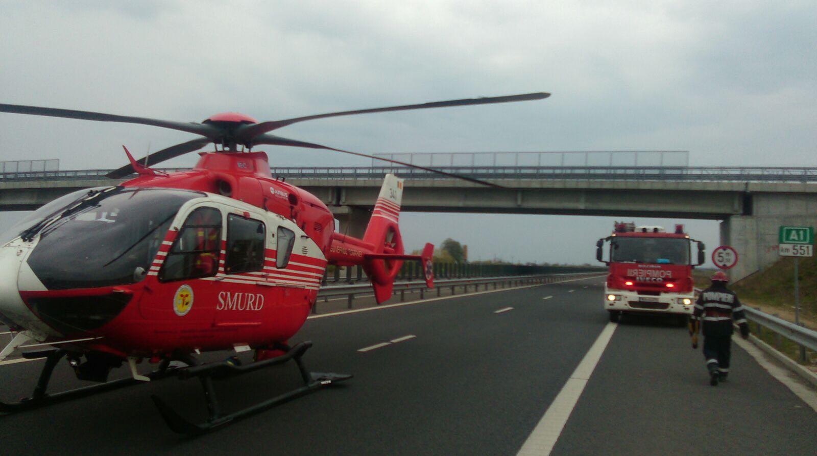 Accident EXTREM DE GRAV, pe A1, la KM 551. Un TIR şi trei maşini implicate, s-a intervenit cu descarcerare, mai multe ambulanţe şi elicopter SMURD (VIDEO)