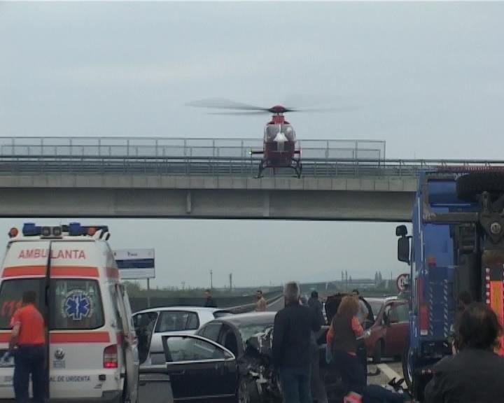 Accident EXTREM DE GRAV, pe A1, la KM 551. Un TIR şi trei maşini implicate, s-a intervenit cu descarcerare, mai multe ambulanţe şi elicopter SMURD (VIDEO)