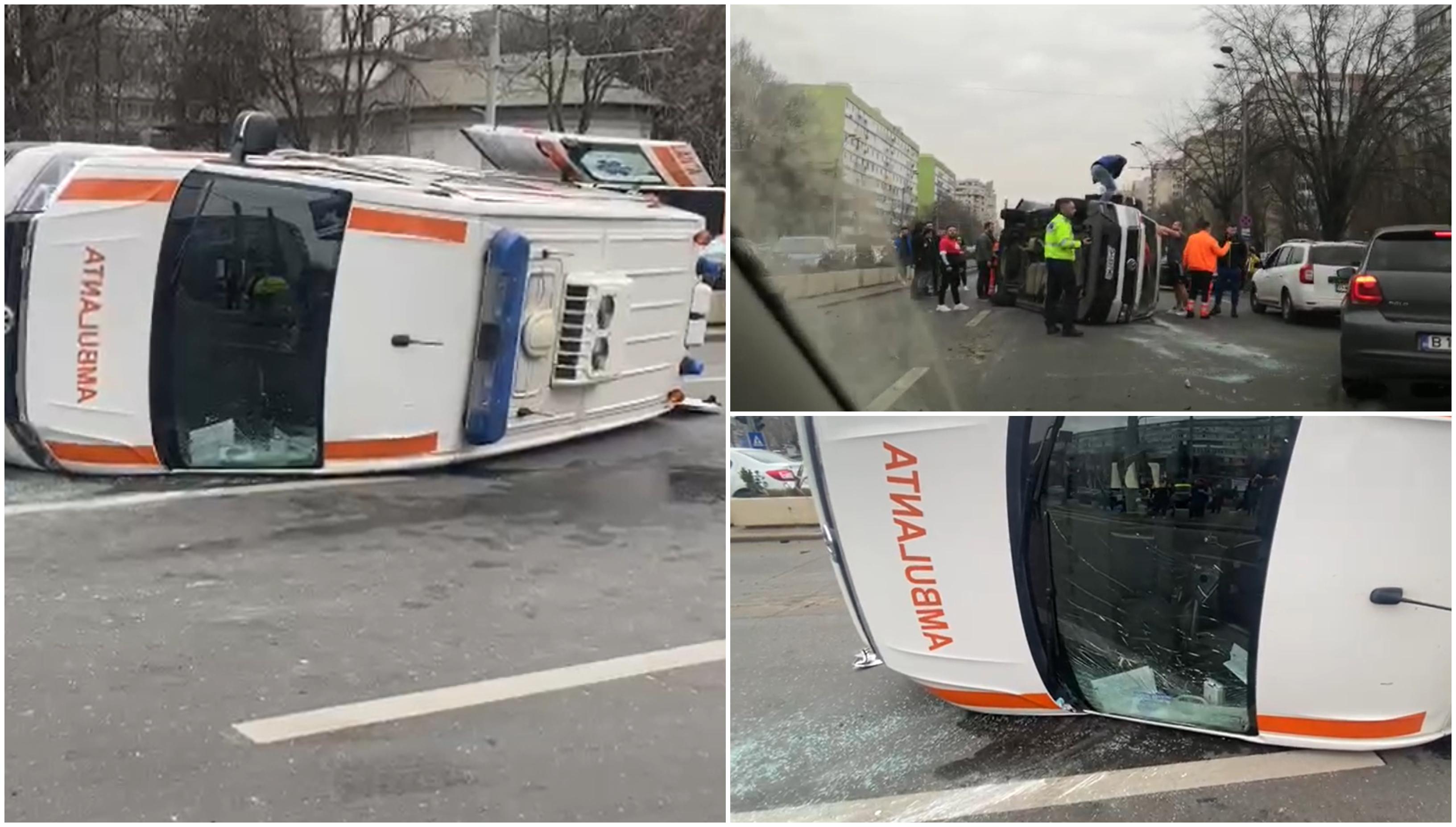 Accident grav în Capitală: O ambulanţă cu pacient s-a răsturnat, după ce a fost izbită puternic de un şofer care nu ar fi auzit sirena