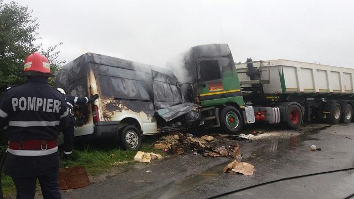 Accident groaznic la Colţirea, în Maramureş. Un TIR a făcut zob un microbuz, care a luat foc după impact. Şoferul a ars în maşină (video)