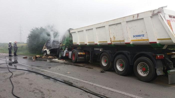 Accident groaznic la Colţirea, în Maramureş. Un TIR a făcut zob un microbuz, care a luat foc după impact. Şoferul a ars în maşină (video)