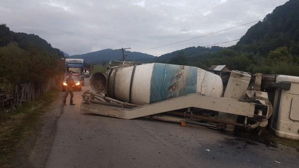 Accident halucinant în Bistriţa. Un şofer a intrat cu BETONIERA în balans şi s-a răsturnat cu mastodontul pe şosea