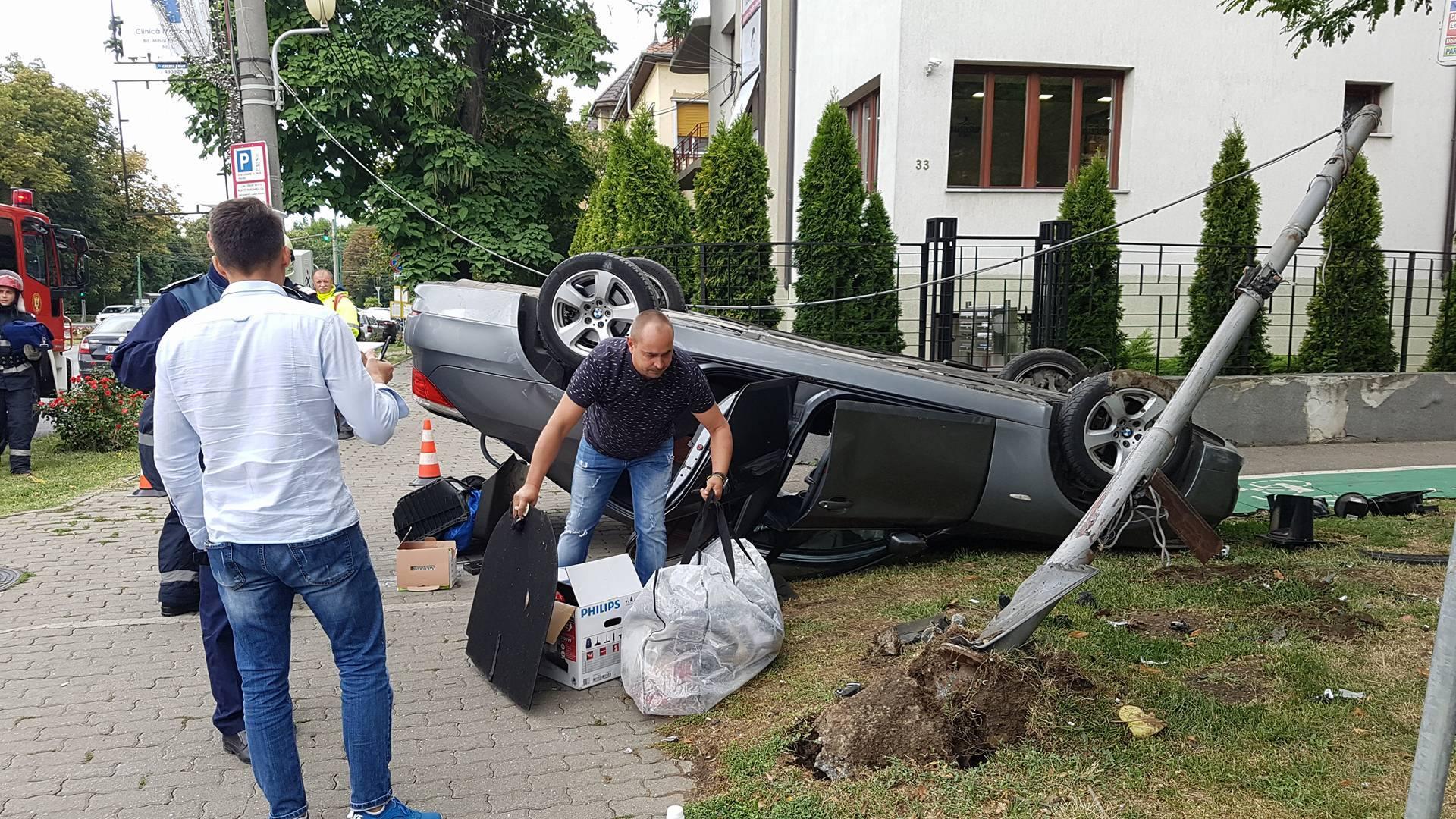 Accident HALUCINANT în centrul Timişoarei. Un BMW a distrus un semafor şi s-a răsturnat pe TROTUAR, după impactul violent cu o altă maşină (VIDEO)
