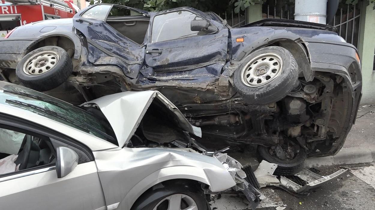 Impact violent într-o intersecţie din Drobeta Turnu Severin. O maşină a strivit-o pe alta, după ce ambele au fost proiectate într-un stâlp