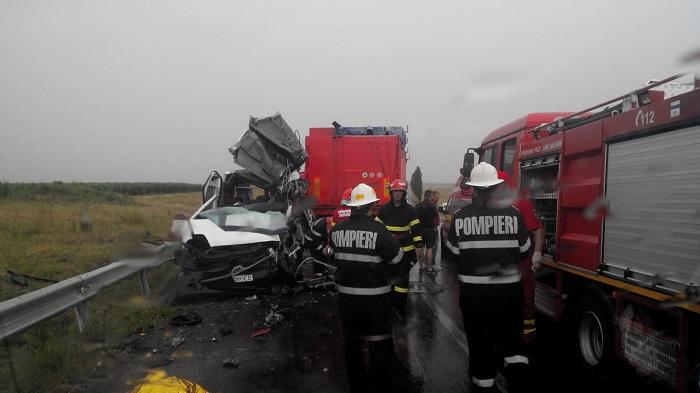 Doi morţi şi doi răniţi grav, după ce un microbuz de pasageri s-a izbit de un TIR, pe o şosea din Brăila