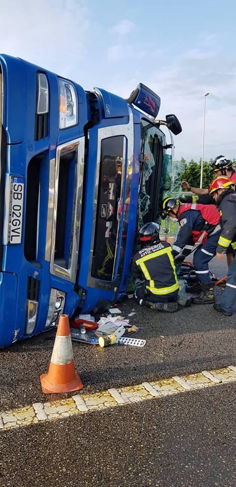Un şofer român a rămas cu braţul prins sub cabină, după ce s-a răsturnat cu TIR-ul pe o autostradă din Spania (video)