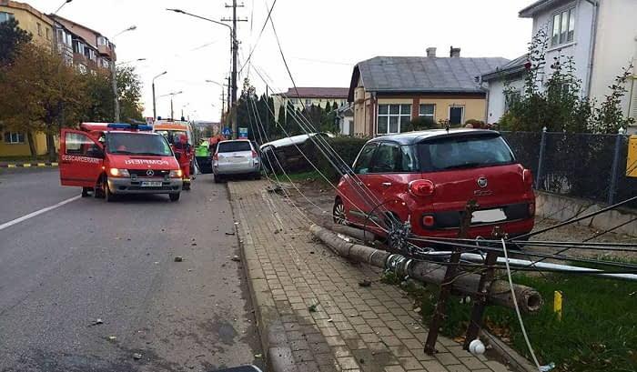 Accident spectaculos în Suceava: un şofer a lovit doi stâlpi şi a răsturnat o maşină parcată