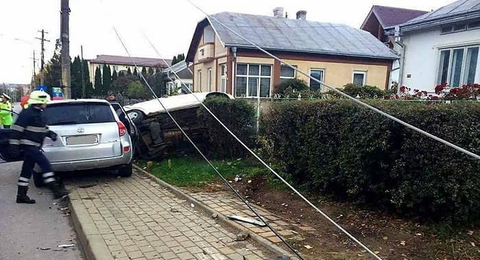 Accident spectaculos în Suceava: un şofer a lovit doi stâlpi şi a răsturnat o maşină parcată