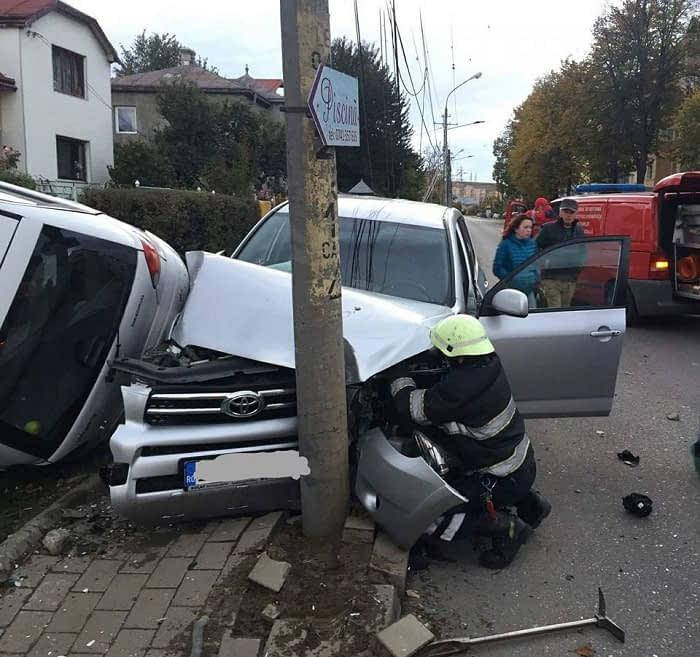 Accident spectaculos în Suceava: un şofer a lovit doi stâlpi şi a răsturnat o maşină parcată