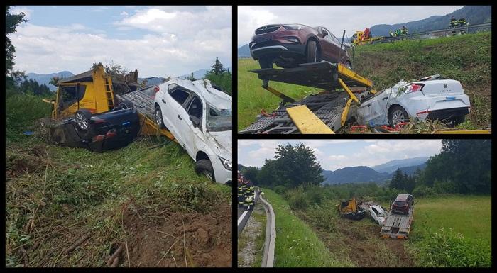 Accident spectaculos provocat de un tânăr şofer român de TIR. Camionul lui platformă, cu 5 maşini noi, a căzut 20 de metri de pe şosea