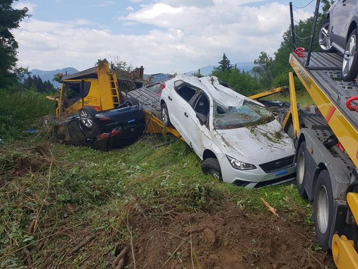 Accident spectaculos provocat de un tânăr şofer român de TIR. Camionul lui platformă, cu 5 maşini noi, a căzut 20 de metri de pe şosea