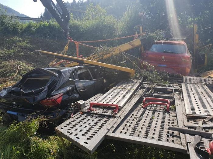 Accident spectaculos provocat de un tânăr şofer român de TIR. Camionul lui platformă, cu 5 maşini noi, a căzut 20 de metri de pe şosea