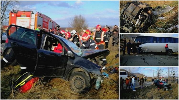 Plan roşu de intervenţie în Bacău, sunt cel puţin 13 victime! Motorul maşinii a zburat zeci de metri, după impactul cu un autocar (Imagini dramatice)